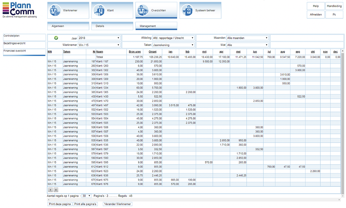 U kunt tot op werkzaamheidniveau zien hoeveel de omzet bedraagt o.b.v. de geplande uren. Is een werkzaamheid wel interessant om intern uit te voeren of besteden we dit wellicht beter uit. Hoeveel omzet genereerd een werknemer, een afdeling of zelfs een kantoor op basis van de geplande uren. Belangrijke informatie voor u als directeur. PlannComm ondersteunt u.