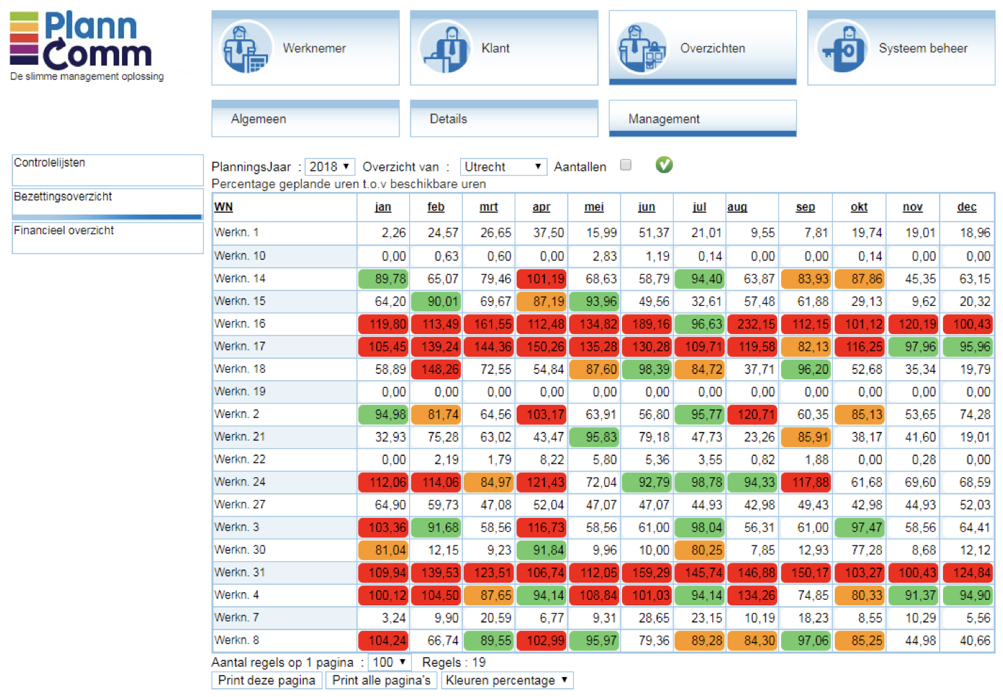 In een oogopslag toont PlannComm bij welke werknemers er teveel is ingepland of dat er juist nog ruimte is qua planning. Dit overzicht wordt weergeven in een percentage van de geplande uren ten opzichte van de beschikbare uren. Dit overzicht kan ook in aantallen worden weergegeven. Hierbij ziet u het verschil tussen de geplande en de beschikbare uren.
