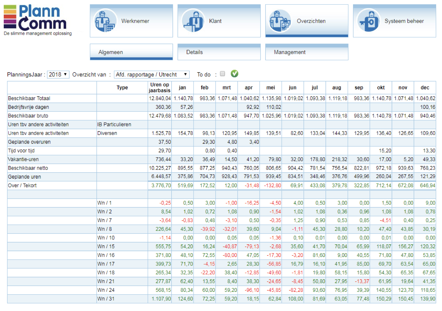 Als manager wilt u weten of een werknemer nog ruimte heeft in de planning of juist vol is ingepland. Komt er een nieuwe klant. Wie heeft ruimte, waar kunnen we schuiven in de planning etc etc. Hoeveel uur zijn er beschikbaar voor een afdeling t.o.v. de ingeplande tijd. Kan die afdeling extra klanten aan of is uitbreiding van het personeelsbestand noodzakelijk. PlannComm geeft het antwoord en heeft u alles onder controle.