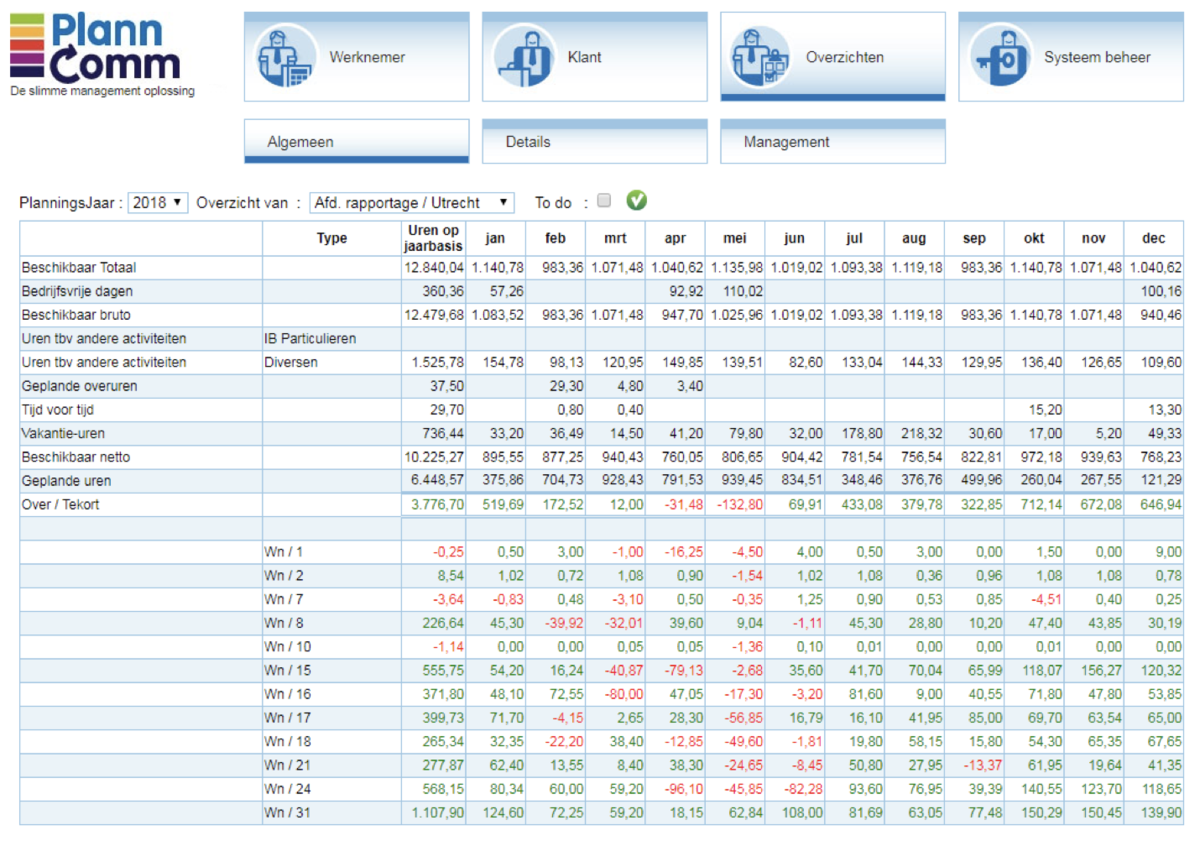 De afdeling rapportage van kantoor Utrecht heeft in de maanden april en mei te weinig uren beschikbaar ten opzichte van de geplande uren. Is het op te lossen met schuiven in de planning? Of kan een ander kantoor bijspringen.  Allemaal Informatie die u nodig heeft om uw werknemers optimaal te laten functioneren.